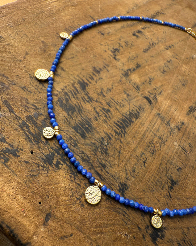 Deep lapis lazuli beads meet hammered gold charms in the Azure Echo Necklace, bringing a touch of ancient elegance to your everyday. Lightweight and easy to wear, it catches the light with every movement.