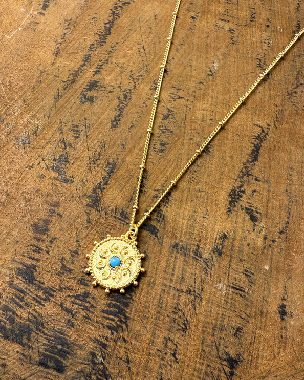 A textured gold medallion encircles a vivid turquoise stone, echoing the protective amulets of ancient times. Lightweight and full of character, it adds a touch of history and meaning to any look.