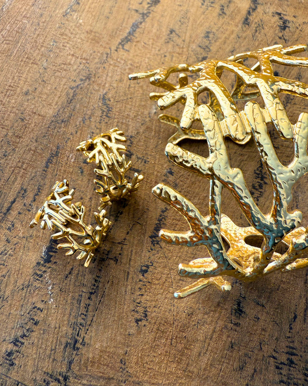 Textured gold branches curve into coral-inspired forms, creating a striking ring and matching cuff. Bold yet organic, the Golden Reef Set channels the beauty and strength of the ocean.