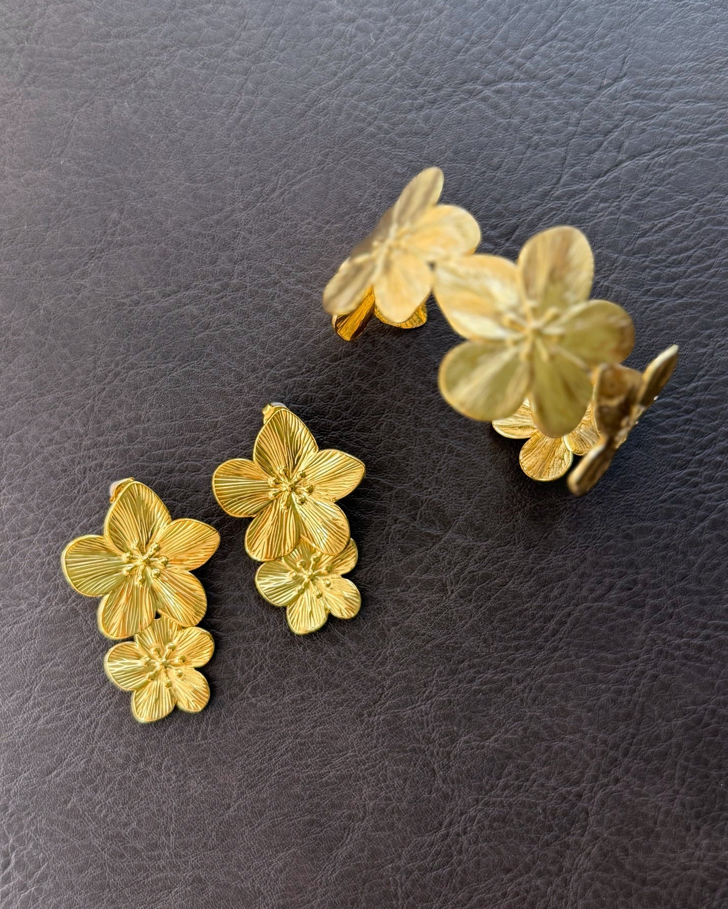 Sculpted cherry blossoms bloom in radiant gold. This floral duo — bold earrings and a matching open cuff — brings elegance and strength into harmony. Bold yet poetic, it’s a tribute to nature’s elegance and feminine power.