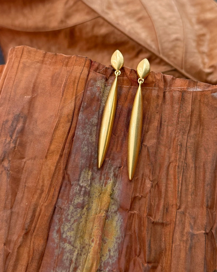 A sculptural drop earring inspired by the curve of a wind-blown leaf. Finished in matte gold or silver, its elongated shape brings soft drama with quiet elegance.