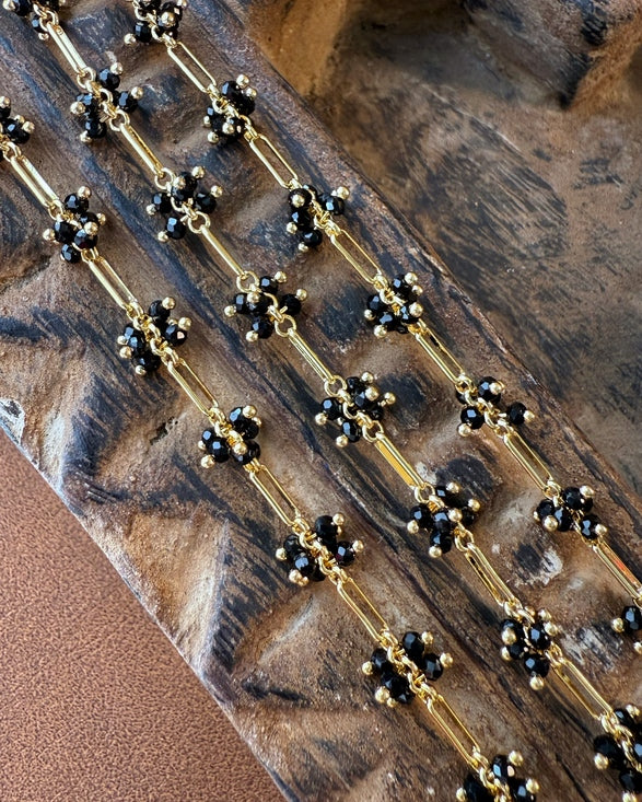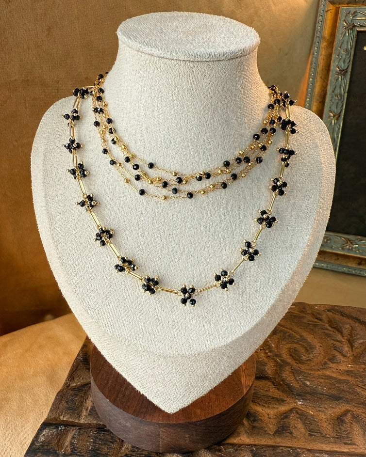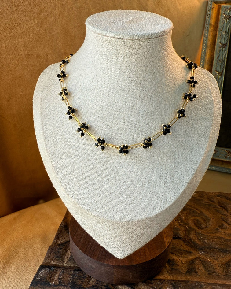 In the quiet of midnight, the garden awakens. Tiny blossoms of black crystal gather in clusters, their petals outlined with gold like stars against the night. The Midnight Bloom Necklace carries this secret rhythm — a chain of light and shadow, bold yet delicate.