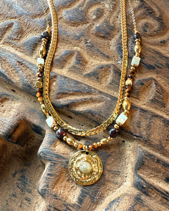 Once worn as a mark of strength, medallions carried the stories of warriors, travelers, and dreamers. This necklace revives that spirit: layered golden chains flowing like rays of sunlight, anchored by the warmth of semi-precious stones. At the center, a textured medallion glows like the sun at dawn — a reminder of power, renewal, and light carried close to the heart.