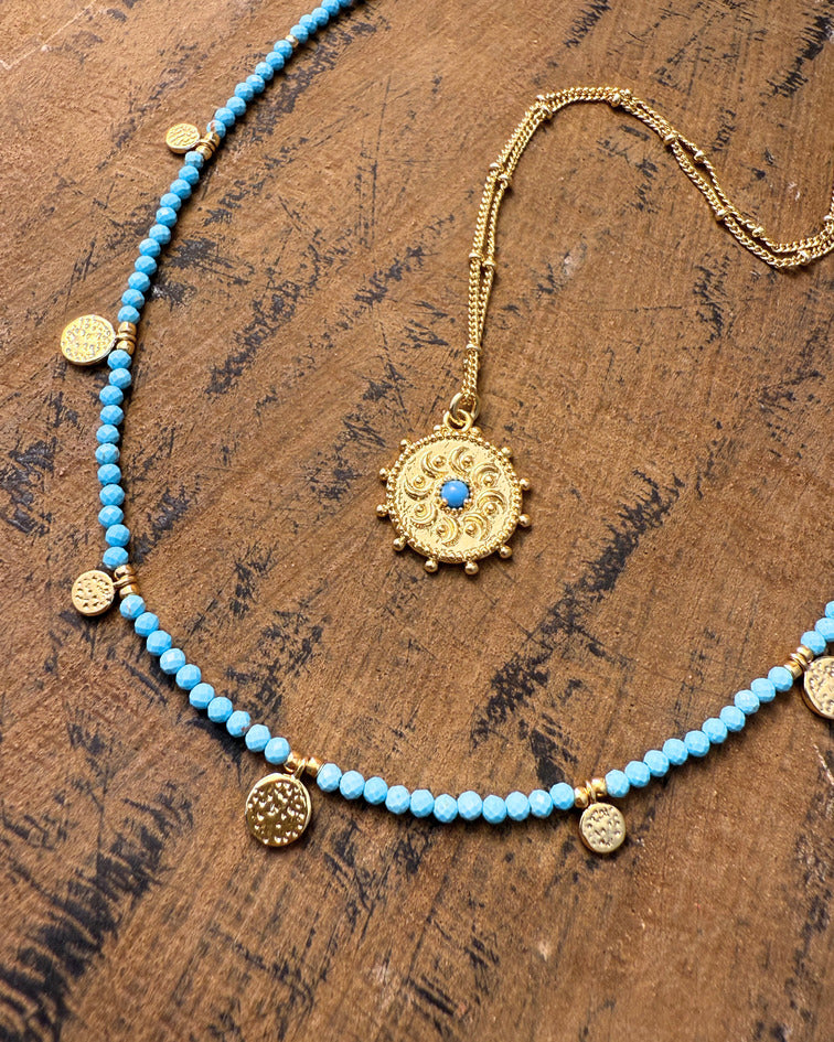 Turquoise beads are strung with hammered gold coin charms, echoing treasures from ancient shores. Lightweight and full of movement, it brings a touch of history to your everyday style.