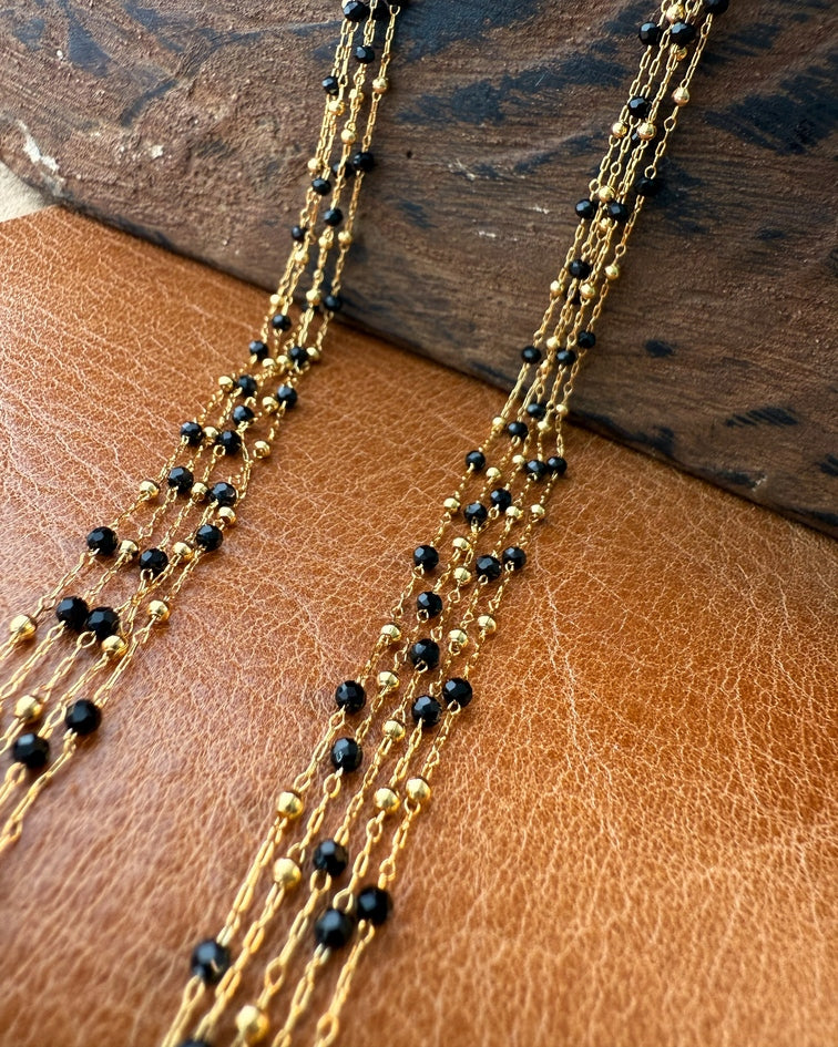 Born from the quiet elegance of nightfall, the Twilight Veil Necklace layers strands of faceted black beads with golden accents, creating a shimmering cascade that moves with light. Delicate yet striking, its multi-strand design drapes gracefully on the neckline. A piece to carry your edge — and your flow.