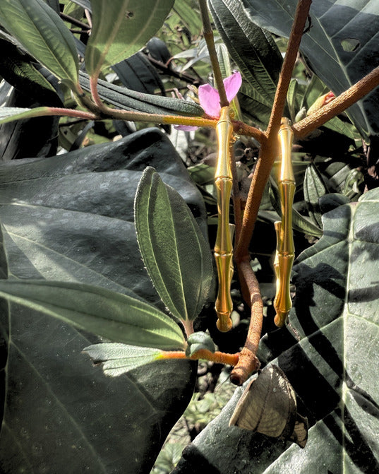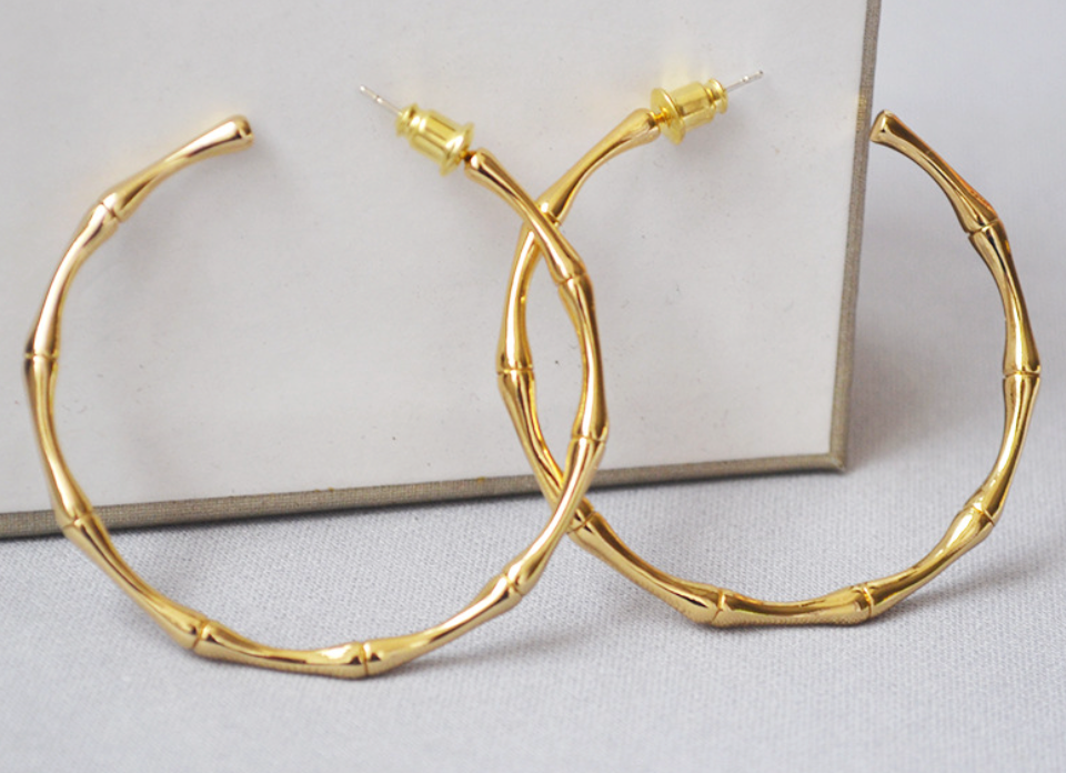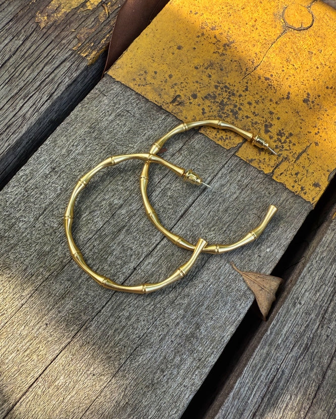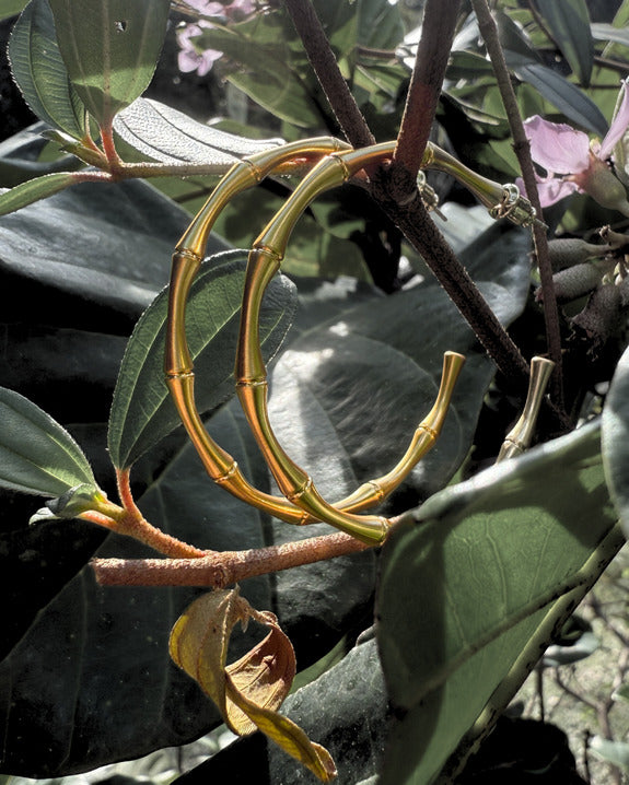 Shaped with the graceful rhythm of bamboo, these hoops bring organic strength and flowing elegance into a timeless form. Crafted in gold plated or 925 sterling silver plated, polished to a smooth gleam, they rest light yet bold on the ear.