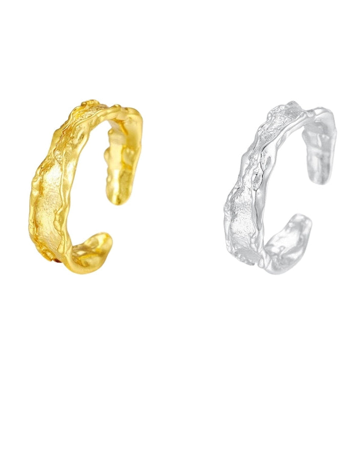 An open band ring with an irregular, crumpled surface that reflects light unevenly rather than brightly.