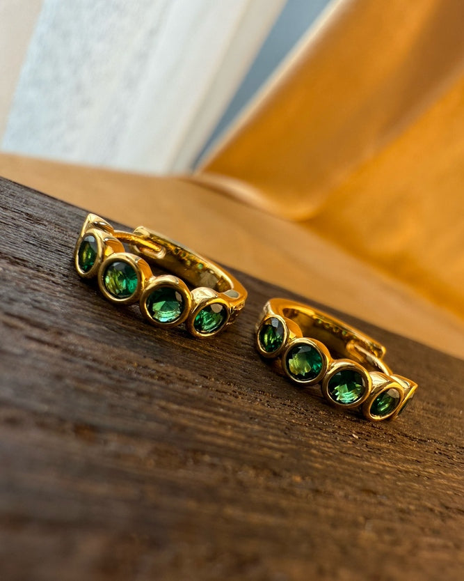 Five green zircon stones shimmer like droplets of forest light, set against a golden hoop. Their rich emerald hue adds a touch of vitality and elegance, perfect for both everyday wear and evening glow.