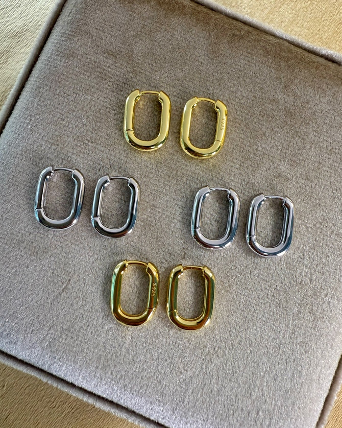 Compact yet bold, these small Eterna Square Hoops are crafted in 925 sterling silver, plated in 18k gold or platinum. Their clean square silhouette carries a modern edge, while the polished surface reflects a timeless glow. Perfect for layering or wearing solo, they add everyday sophistication with a subtle statement.