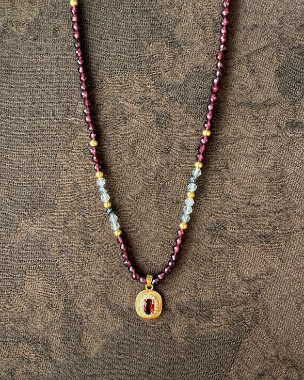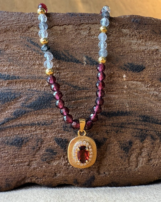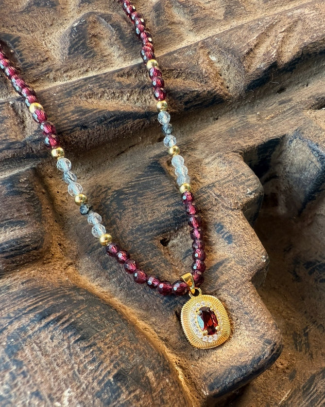 A necklace that shimmers with deep garnet light — faceted beads in rich red and clear crystal, touched with gold accents, centering on a glowing garnet pendant framed in radiant gold. Elegant yet full of character, it carries both festive warmth and everyday magic.
