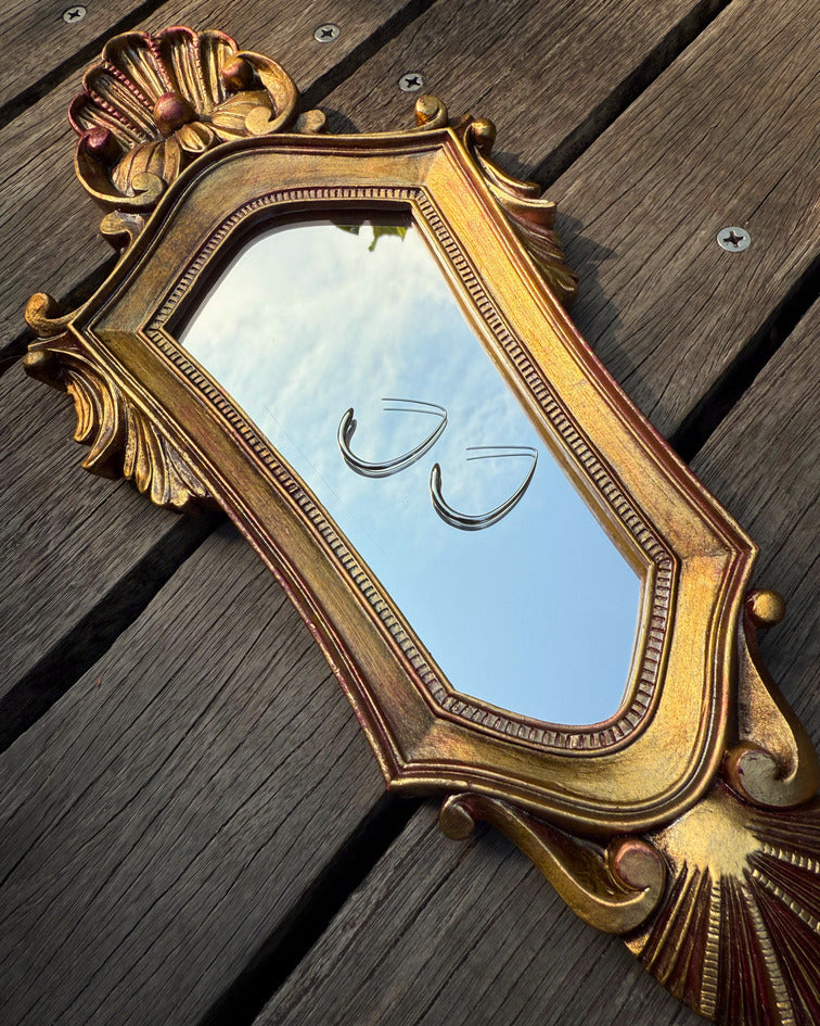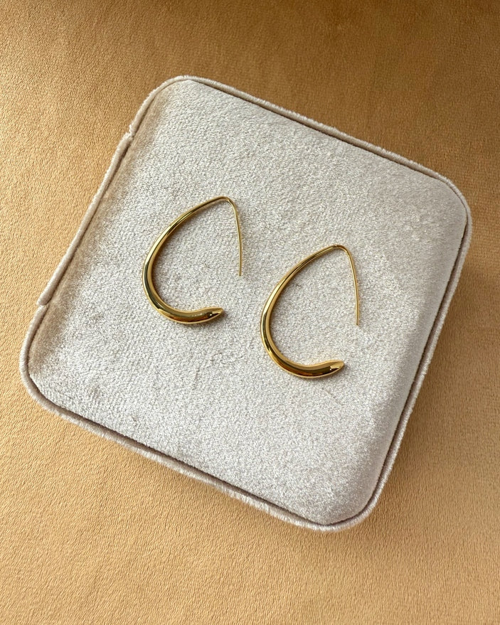 A teardrop form, softened into a golden/silver curve that echoes the quiet grace of the moon. Polished to a smooth glow, these earrings rest light and fluid, bringing a touch of sculptural elegance to every day.