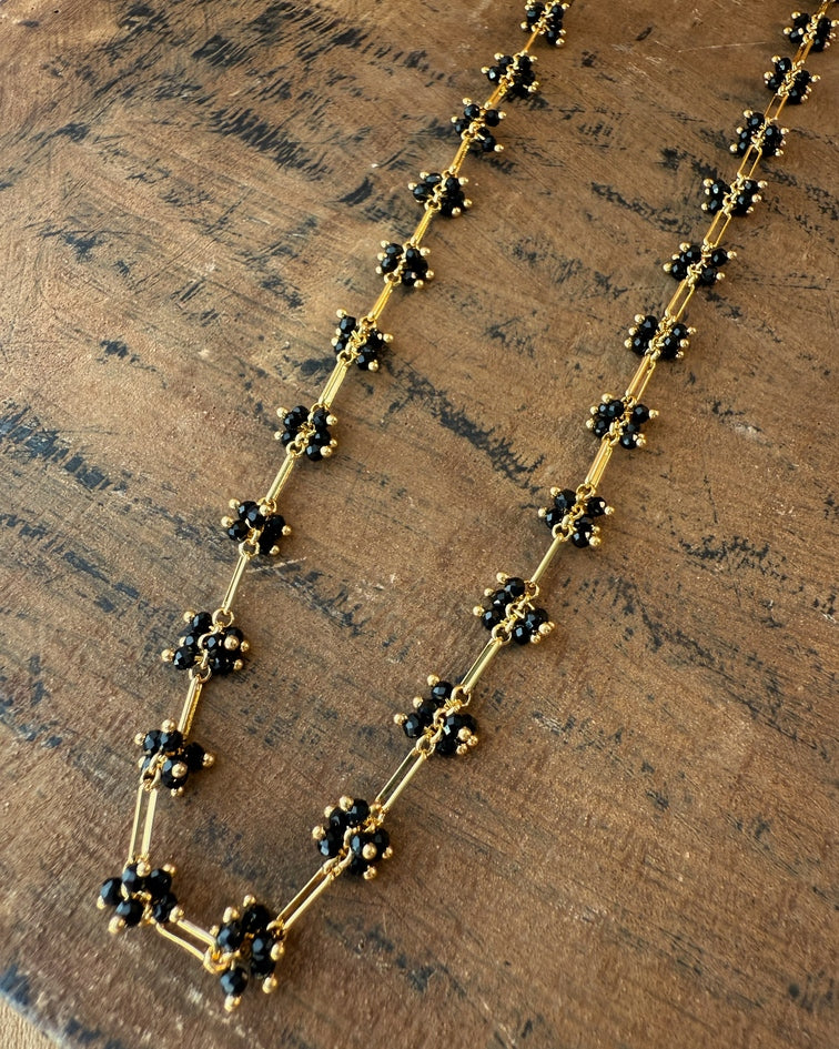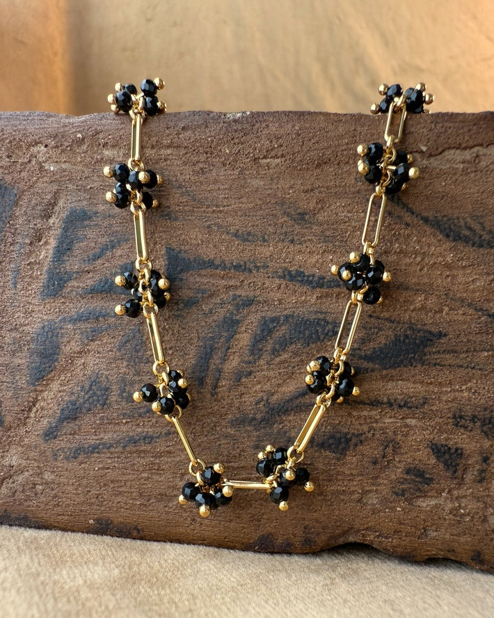 In the quiet of midnight, the garden awakens. Tiny blossoms of black crystal gather in clusters, their petals outlined with gold like stars against the night. The Midnight Bloom Necklace carries this secret rhythm — a chain of light and shadow, bold yet delicate.