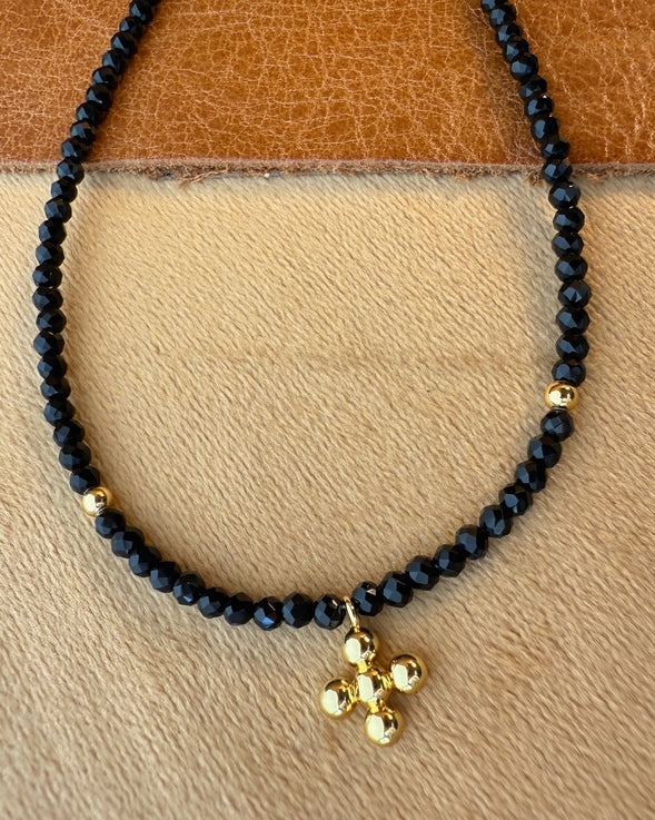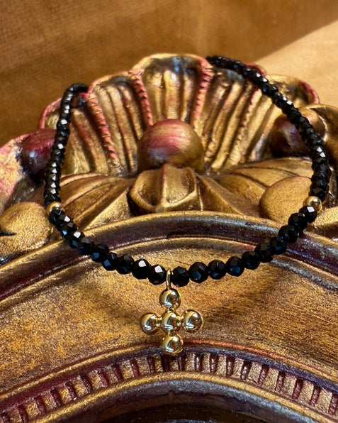 In the stillness of night, a flower quietly opens in the dark — delicate yet unshaken. Each black spinel bead shimmers like midnight dew, while golden sparks scatter between them. At the center, a molten-shaped golden flower blooms, a small reminder that beauty can thrive even in shadow.