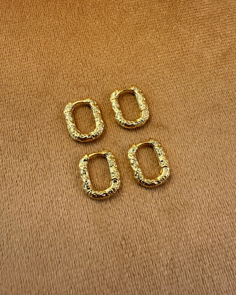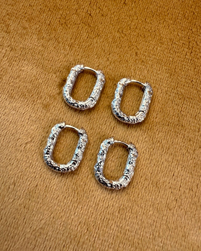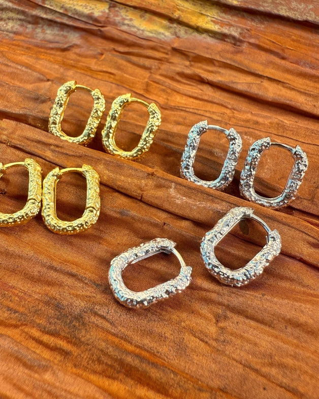 Forged as if metal once flowed like fire, the Molten Edge Hoops carry the memory of movement frozen in time. Their textured surface catches the smallest flicker of light, shifting with every turn of your head — like sparks you wear in your everyday rhythm.