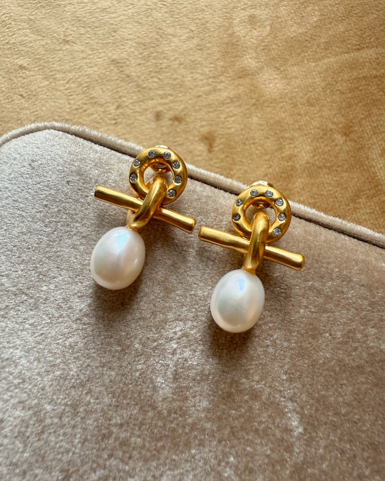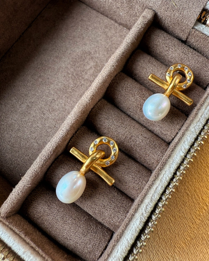 A golden circle meets a freshwater pearl, echoing ancient symbols with a hint of Egyptian charm. Simple, mysterious, and effortlessly elegant.