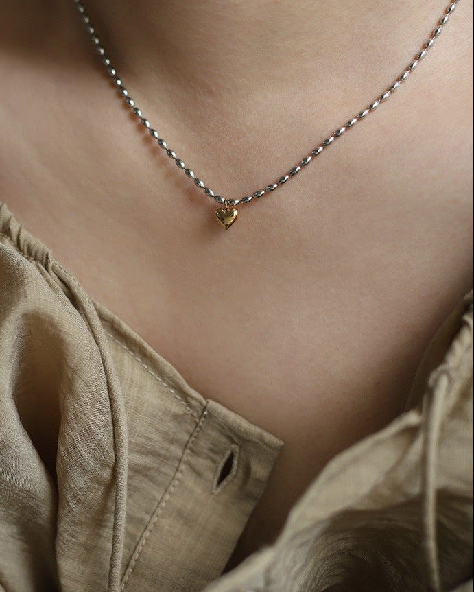 A silver bead chain finished with a softly polished gold heart pendant.