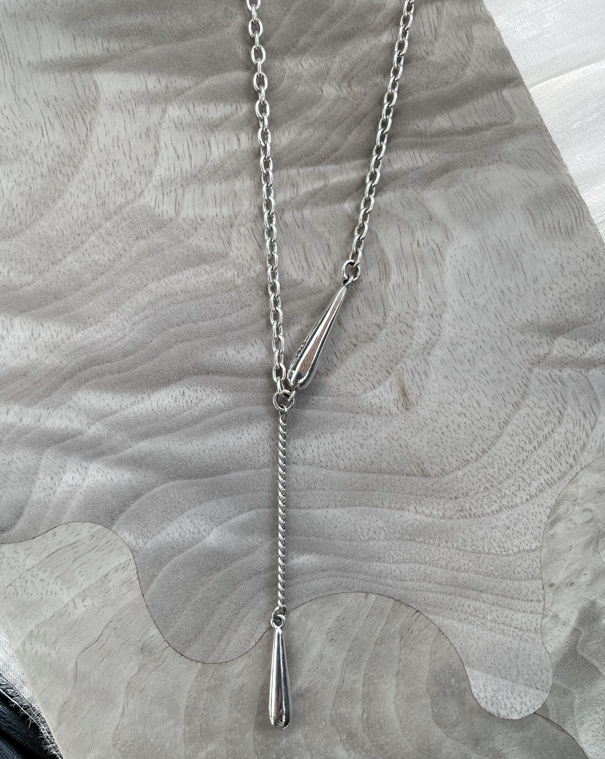 Minimal yet full of movement, the Silver Drop Necklace features two smooth teardrop forms suspended on a sleek sterling silver chain.