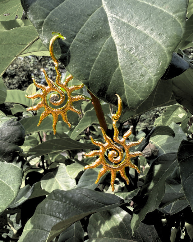 Burning with raw energy, the Solar Spiral pieces feature a hand-textured sun symbol — alive with motion, warmth, and ancient rhythm.
