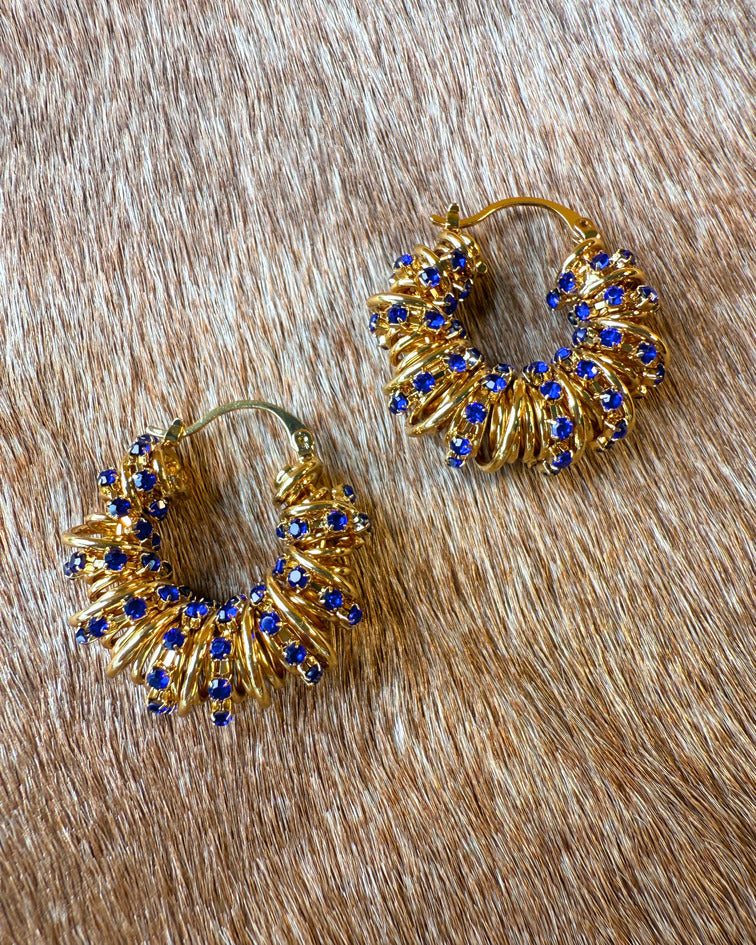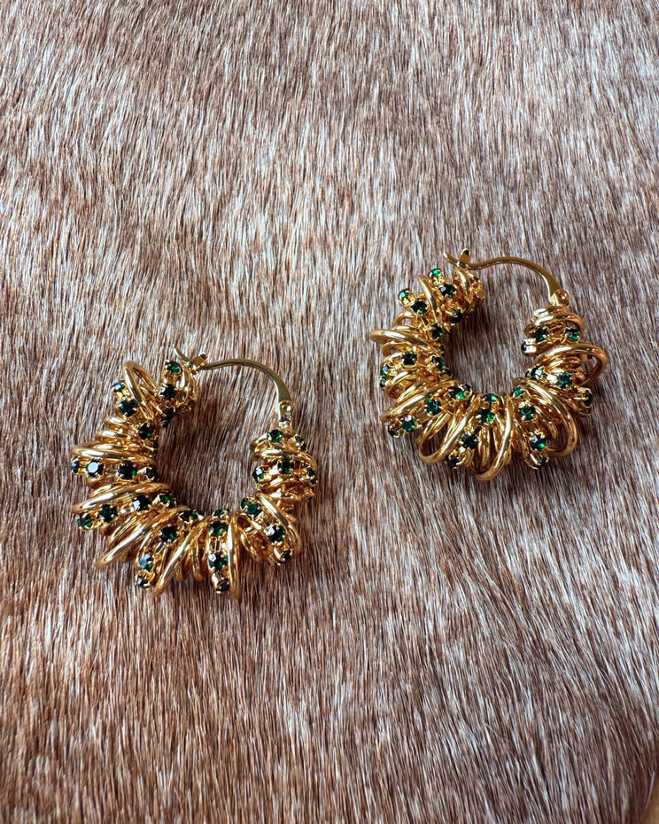 A dance of sparkle and rhythm — the Spinlight Hoops are crafted with golden spirals stacked around luminous green zircon stones.