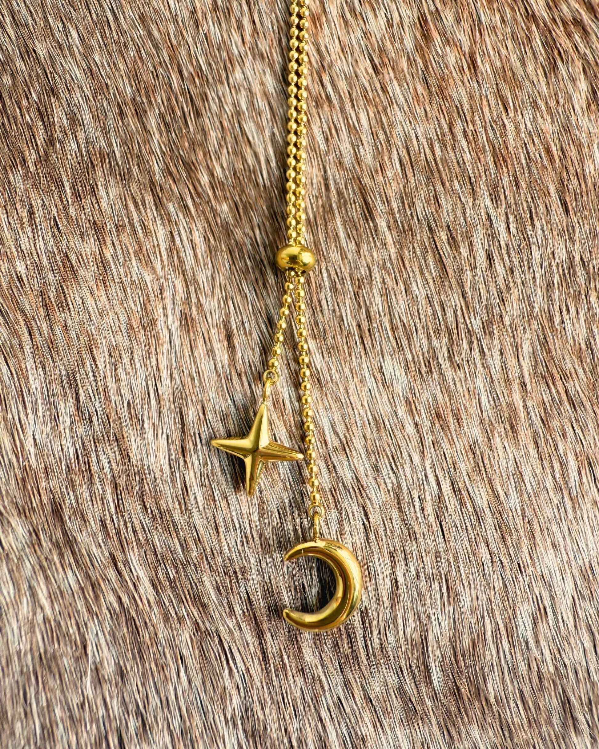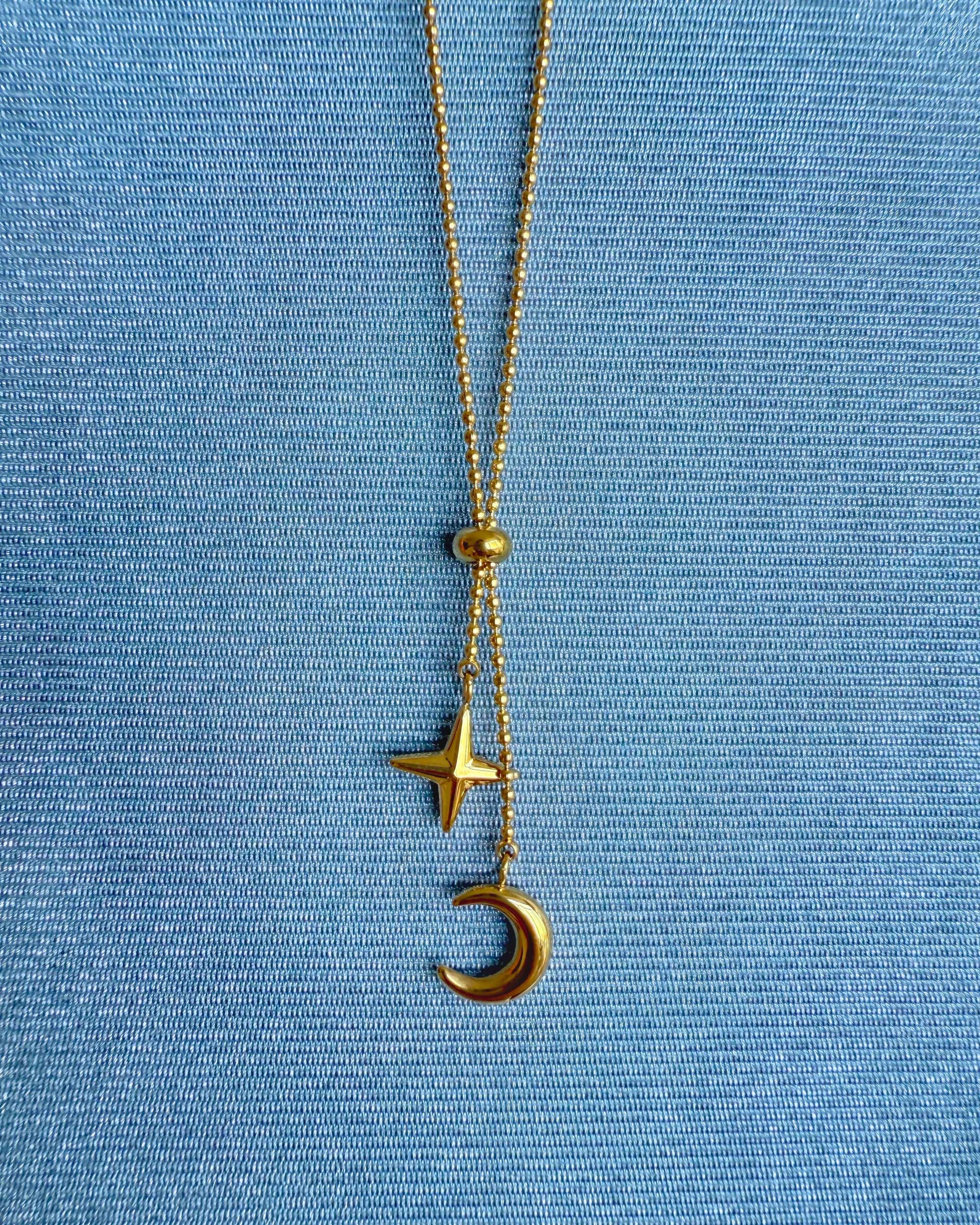 Starry Night Necklace features a delicate beaded chain with an adjustable front slider, finished with star and crescent moon charms.