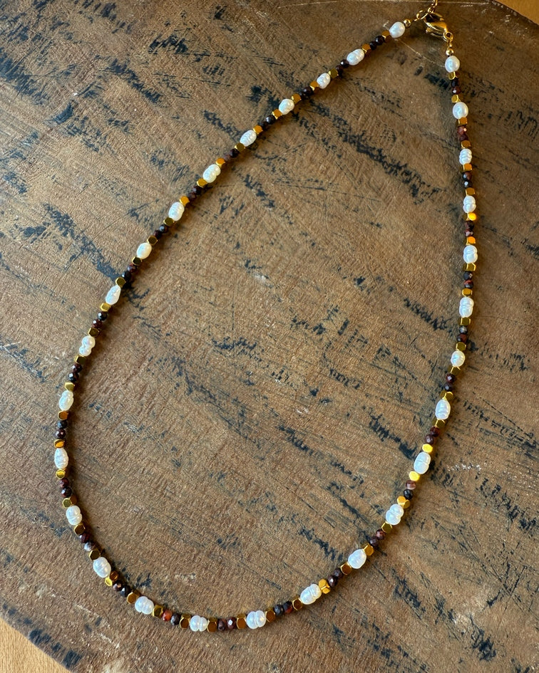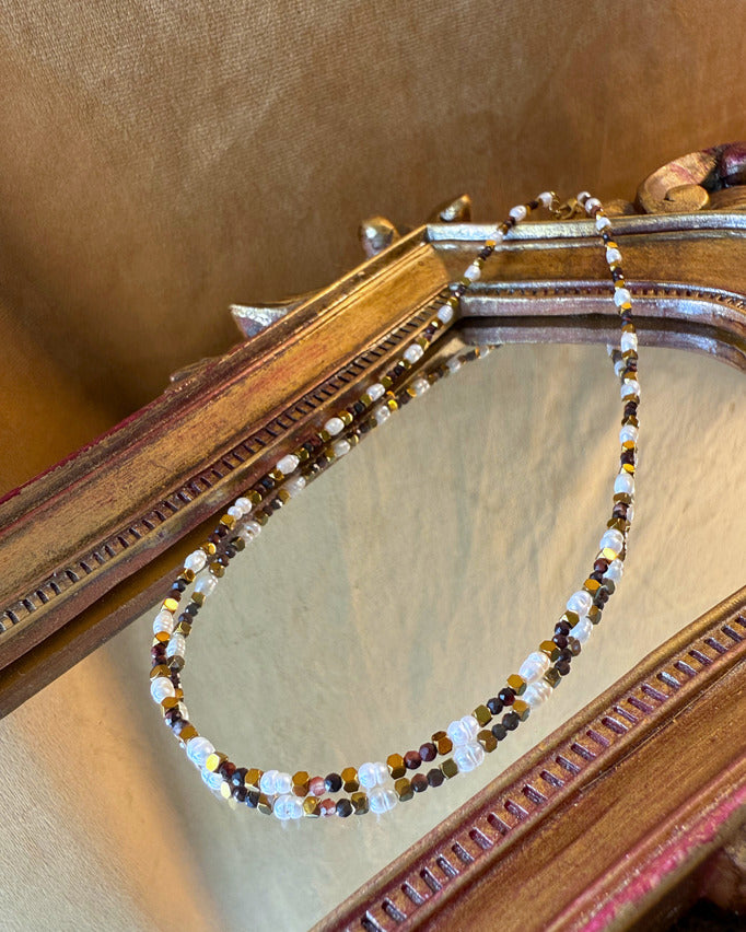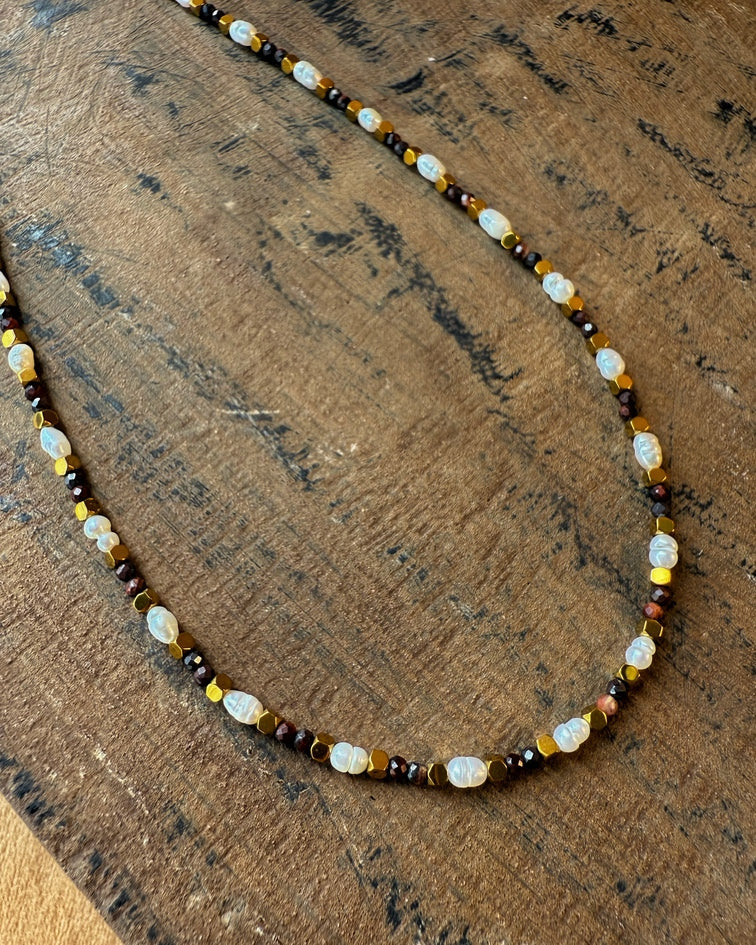 An echo of the ancients — golden-brown tiger’s eye beads radiate protective strength, while freshwater pearls glow with timeless softness. Together, they weave a necklace that carries both grounded power and luminous grace.