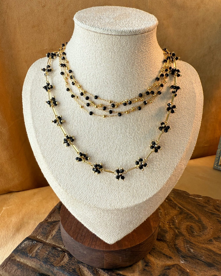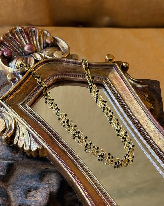 Born from the quiet elegance of nightfall, the Twilight Veil Necklace layers strands of faceted black beads with golden accents, creating a shimmering cascade that moves with light. Delicate yet striking, its multi-strand design drapes gracefully on the neckline. A piece to carry your edge — and your flow.